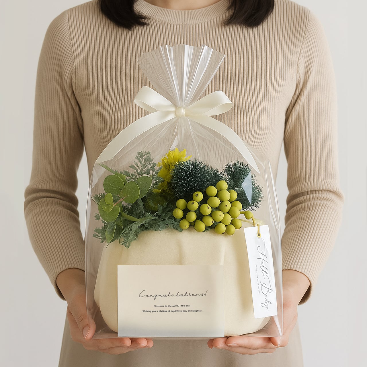 ■セット内容:おむつ、バッグ(巾着orマルシェ)、アレンジフラワー、ギフトラッピング、タグ&メッセージカード
