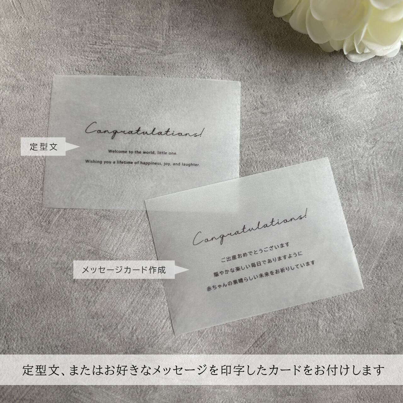 定型文またはお好きな文章を印字したメッセージカードを添えてお届けいたします。