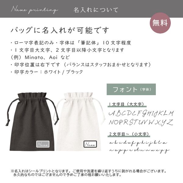 シンプルなコットンリネンの巾着バッグにお名前などの文字入れをいたします。