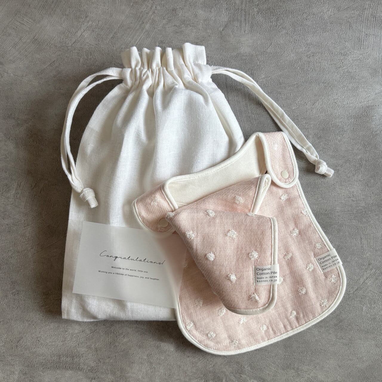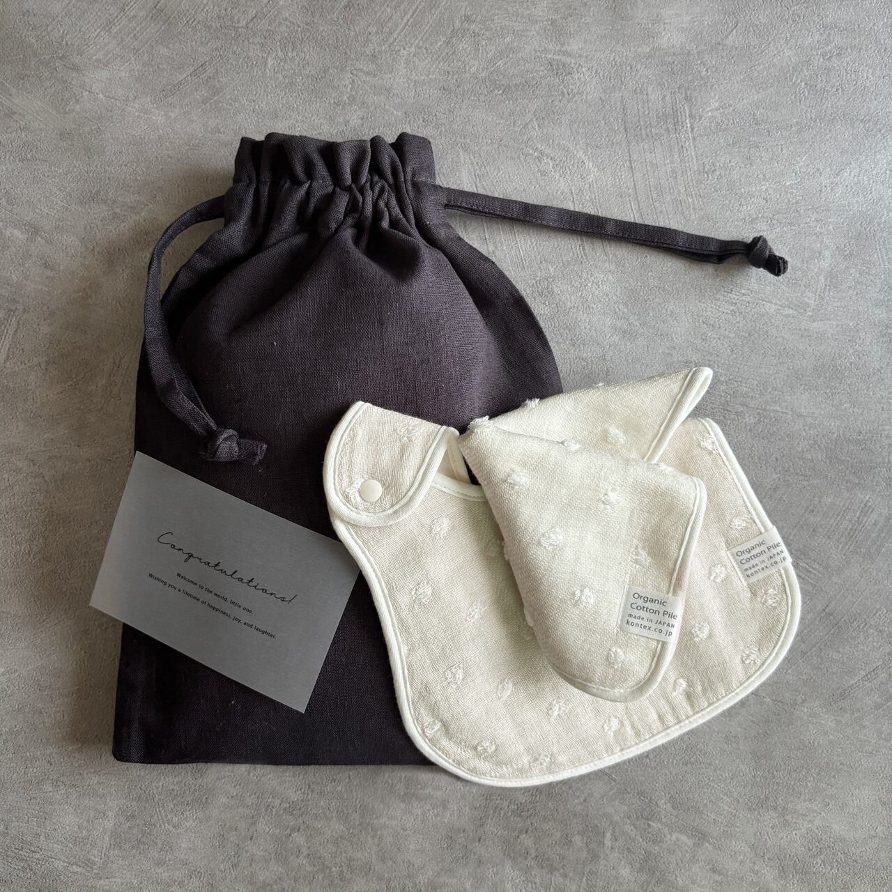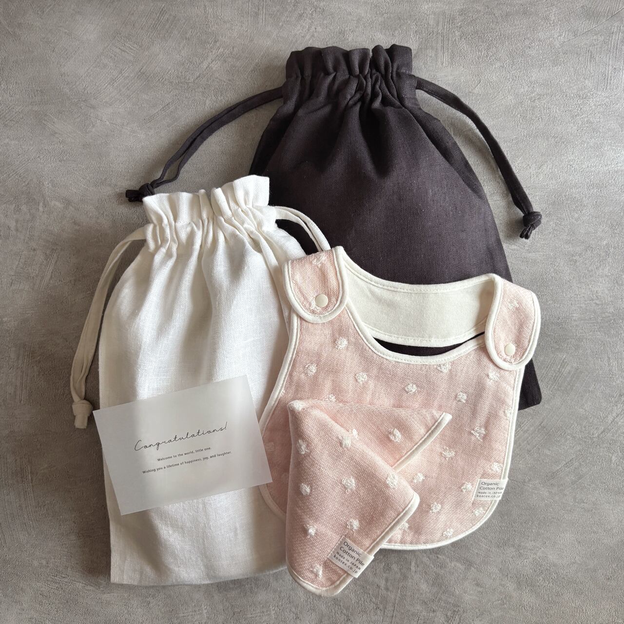 名入れが出来る巾着バッグと、日本製のハンカチ&スタイとおむつを入れてメッセージカードを添えたシンプルなギフト